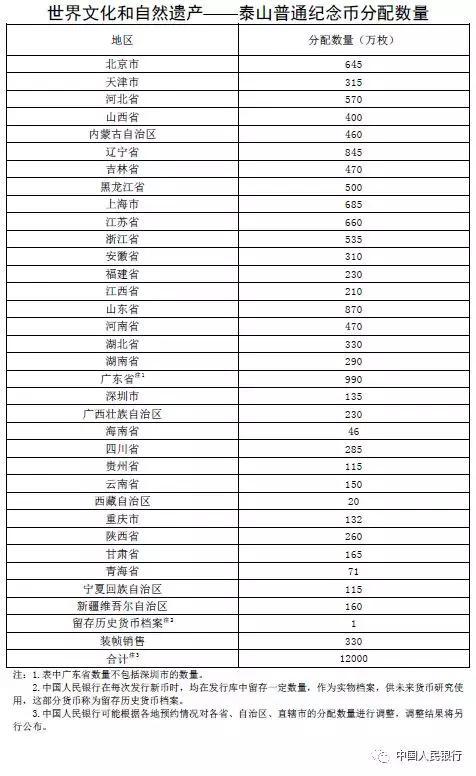 世界文化和自然遗产——泰山普通纪念币面额为5元,式样为圆角正方形,外接圆直径为30毫米,材质为黄铜合金,发行数量为1.2亿枚。世界文化和自然遗产——泰山普通纪念币在各省、自治区、直辖市分配数量如下:
