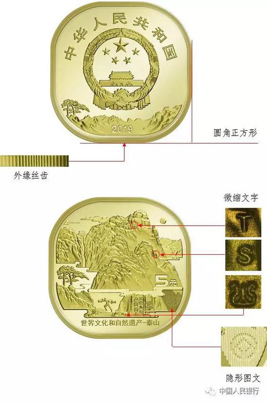 在硬币背面泰山局部山体和泰山石刻左下方,可以观察到微缩文字“T”、“S”和篆体“山”。